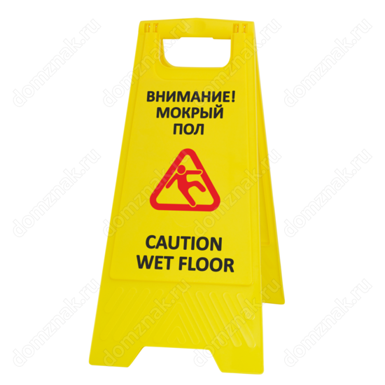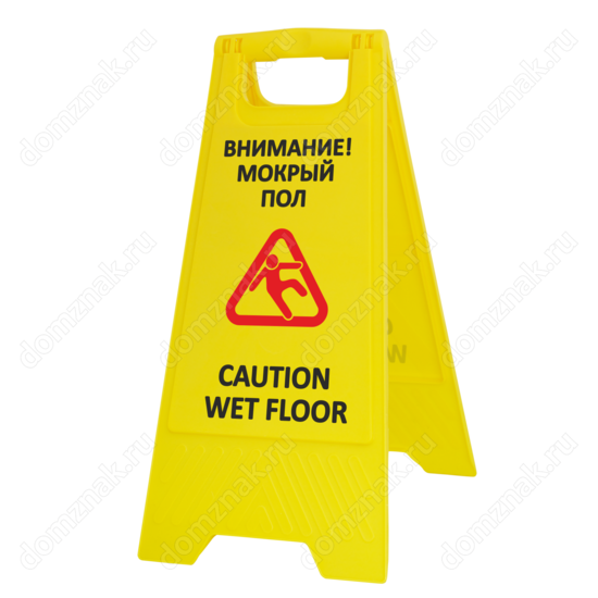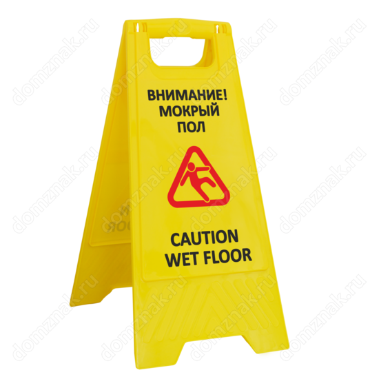 Оповестите посетителей и персонал вашего заведения о мокром покрытии в помещении, установив напольную табличку «Мокрый пол». Ее рекомендуется использовать для уменьшения вероятности травмирования людей после проведения влажной уборки. Табличка имеет яркий желтый цвет, легкую, но прочную и устойчивую конструкцию. Надписи на двух языках (русском и английском) и знак на ней контрастны и хорошо видны на большом расстоянии.