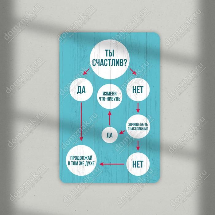 Табличка «Ты счастлив?» изготовлена из пластика ПВХ, толщиной 4 мм. Изображение наносится по технологии УФ-печати. Табличка предназначена для использования как в помещении, так и на улице.
