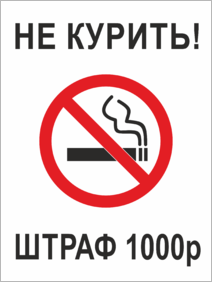 Табличка «Не курить, штраф» – убедительный текст поддерживается лаконичным дизайном и озвученной конкретной цифрой штрафа. Красно-черная цветовая гамма и белый фон привлекают внимание – Ваше требование не останется незамеченным.