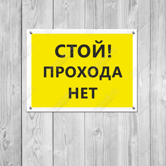 Жёлтый фон и крупный шрифт чёрного цвета – что ещё нужно, чтобы обратить внимание людей на территорию, куда не следует заходить? Несмотря на отсутствие графических элементов, табличка «Стой! Прохода нет» привлекает взгляды и видна в разное время суток.